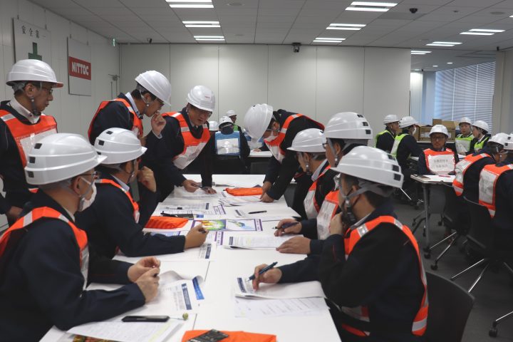 訓練は、危機管理B対策本部を中心に、参加者を総務班、対外班、支援班などのグループに分けて進行しました。被害状況に加え、インフラや交通網の状況など、大規模災害時に想定される事象を付与した中で、連絡が途絶している状況における対応策を各グループで協議・検討しました。