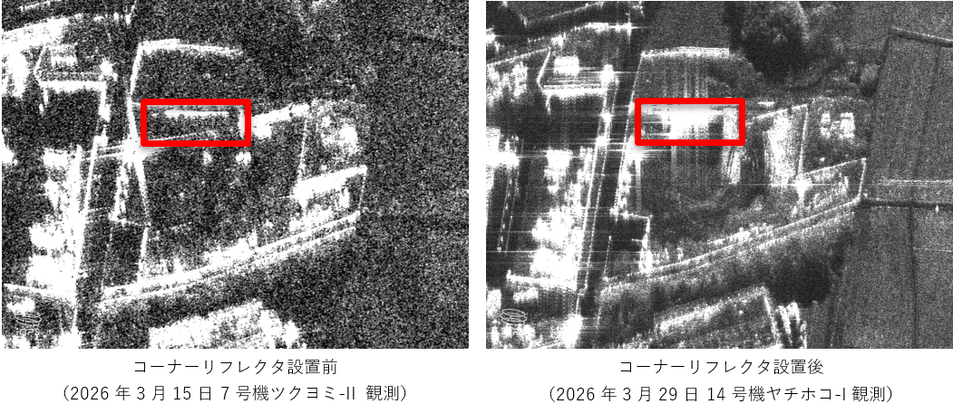 リフレクタの設置工事後、複数の衛星による観測機会がある中、2026年3月29日5時52分(日本時間)に商用稼働中のQPS-SAR14号機「ヤチホコ-Ⅰ」がNITTOCテストフィールドの観測を実施。得られたSAR画像において、コーナーリフレクタの位置、状況(画像の赤で囲った箇所)を確認することができました。